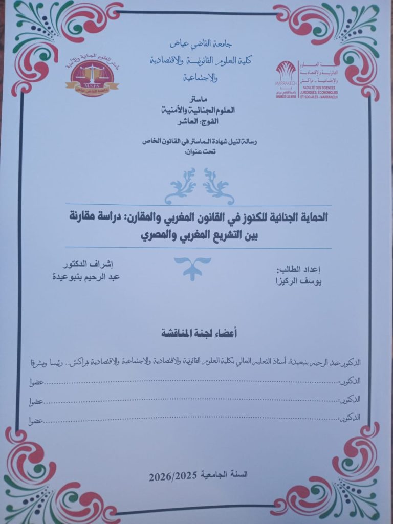 وتتناول الرسالة موضوعًا ذا أهمية قانونية خاصة يتعلق بحماية الكنوز والتراث المادي، عبر دراسة معمقة للإطار القانوني المغربي، ومقارنته بنظيره المصري، بهدف إبراز مكامن القوة والقصور واقتراح سبل لتعزيز المنظومة القانونية في هذا المجال.