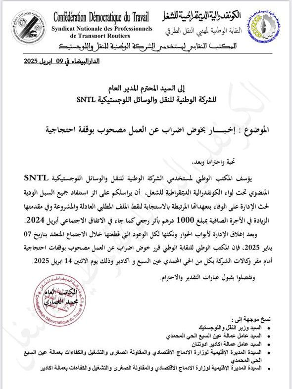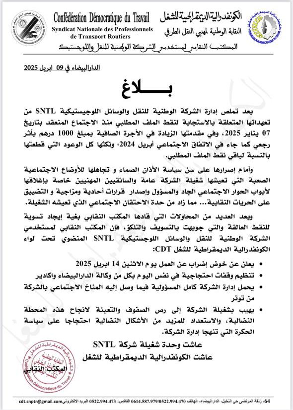 في ظل تصاعد التوترات الاجتماعية بين إدارة الشركة الوطنية للنقل واللوجستيك (SNTL) ونقابة العمال المنضوية تحت لواء الكونفدرالية الديمقراطية للشغل (CDT)، أعلن المكتب النقابي لعمال الشركة عن خوض إضراب عام يوم الاثنين 14 أبريل 2025، مصحوبًا بوقفات احتجاجية أمام وكالات كل من الدار البيضاء (الحي المحمدي وعين السبع) وأكادير.