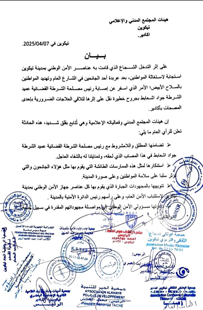 في ظلّ أجواءٍ من القلق المجتمعي، توحدت أصوات هيئات المجتمع المدني والإعلامي بمدينة تيكوين في تعبير صادق عن التضامن مع رئيس مصلحة الشرطة القضائية، العميد جواد أشعابط، الذي تعرّض لإصابات خطيرة خلال تدخل أمني بطولي لمواجهة عربدة مسلَّح هدّد سلامة المواطنين بالشارع العام. الحادثة، التي هزّت هدوء المدينة و أعادت الجدل حول تحديات الأمن وثمن التضحيات التي يقدمها رجال الأمن في مواجهة العنف الطائش.