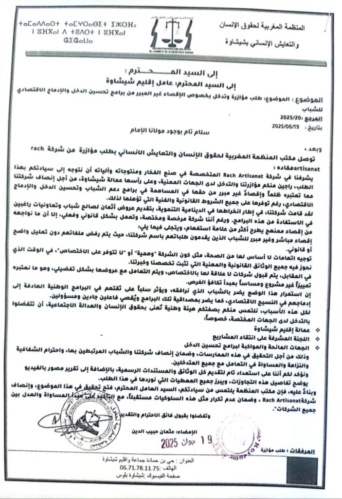 توصل مكتب المنظمة المغربية لحقوق الإنسان والتعايش الإنساني بطلب مؤازرة من شركة Rach Artisanat المتخصصة في صناعة الفخار ومنتوجاته، عبّرت فيه عن تظلمها مما وصفته بـ”الإقصاء غير المبرر” من برامج دعم الشباب وتحسين الدخل والإدماج الاقتصادي بإقليم شيشاوة، رغم توفرها حسب تعبيرها على كافة الشروط القانونية والمهنية.