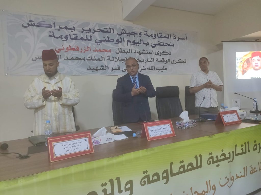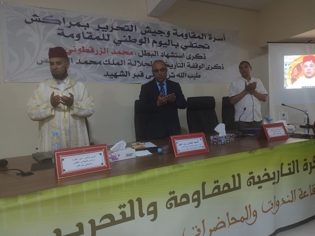 في إطار تخليد الشعب المغربي، وفي طليعته أسرة المقاومة وجيش التحرير، للذكرى 71 لليوم الوطني للمقاومة، والذكرى 69 للوقفة التاريخية لجلالة المغفور له محمد الخامس أمام قبر الشهيد محمد الزرقطوني، نظمت المندوبية السامية لقدماء المقاومين وأعضاء جيش التحرير – النيابة الجهوية بمراكش آسفي – حفلاً خطابياً وفعاليات تخليدية متميزة، مساء يوم الأربعاء 18 يونيو 2025، بفضاء الذاكرة التاريخية للمقاومة والتحرير التابع للنيابة الجهوية للمندوبية السامية لقدماء المقاومين وأعضاء جيش التحرير بجهة مراكش أسفي.