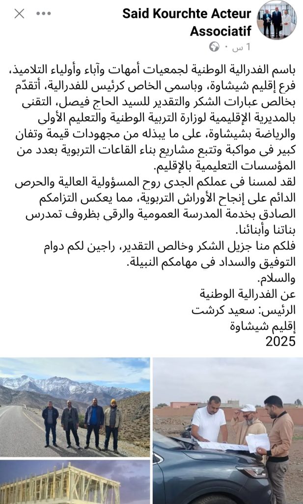 وجاء في تدوينة نشرها رئيس الفدرالية على صفحته الرسمية بموقع “فيسبوك”، أن الحاج فيصل عبدلي يُعدّ “نموذجًا في التفاني والانضباط المهني”، نظير مواكبته اليومية لأوراش بناء القاعات الدراسية بعدد من المؤسسات التعليمية بالإقليم، وتفاعله المسؤول مع مختلف المستجدات التي تهمّ تأهيل البنية التربوية.