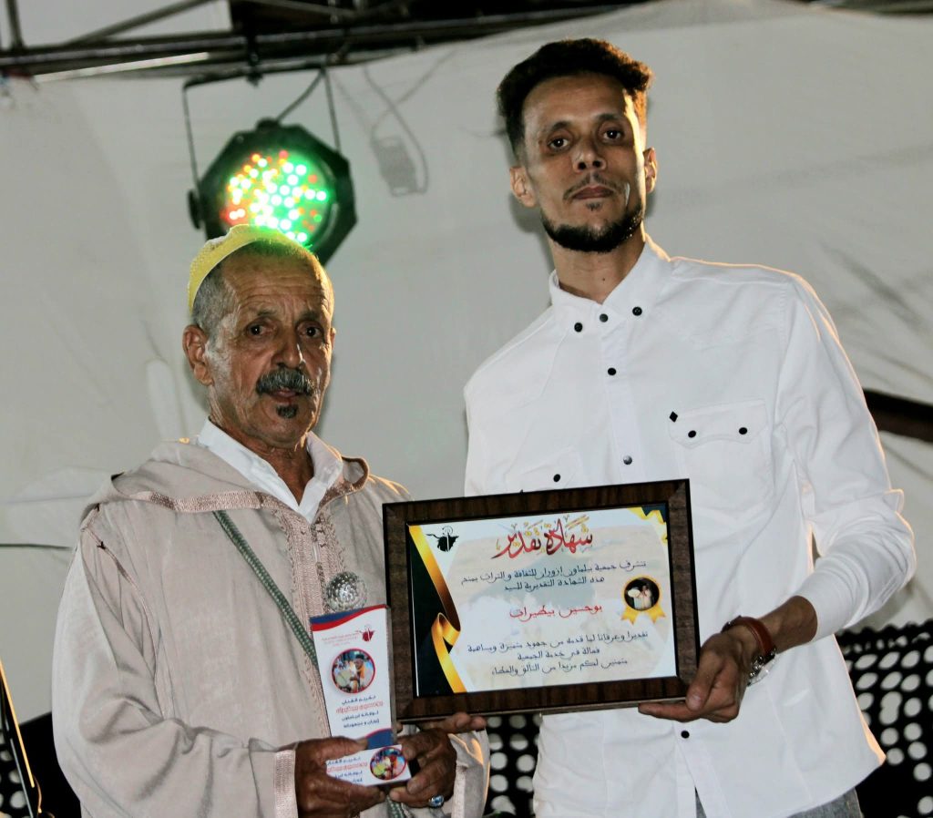 الحفل الختامي لبيلماون إزوران كان مفاجأة مميزة تمثلت في تكريم الفنان “بوحسين بيطيرات” الذي قدمته جمعية بيلماون إزوران جاء عرفانا بمسيرته الحافلة بالعطاء والعمل الجاد في خدمة الثقافة الأمازيغية وتعزيز المشهد الجمعوي بإمنتانوت.