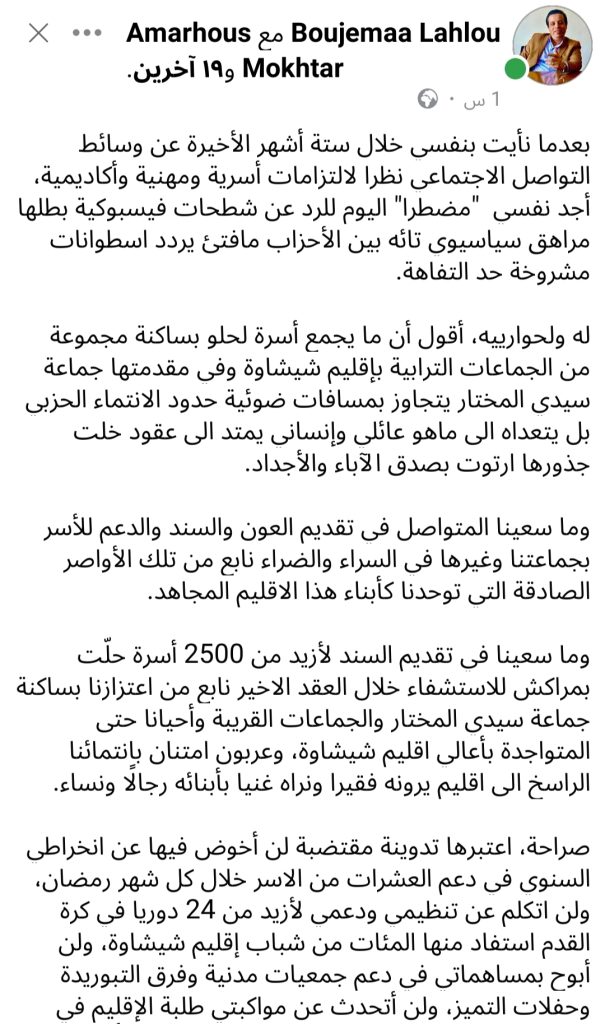 وختم تدوينته بالتأكيد على أن ما ذكره ليس من باب الاستعراض أو الرد بالتفصيل، بل تذكيرٌ فقط بجزء يسير من العمل المتواصل الذي يتم في صمت، وفاءً لانتمائه لجماعة سيدي المختار وإقليم شيشاوة، واعدًا بمواصلة العمل والترافع محليًا وجهويًا ووطنياً من أجل تحسين مستوى الخدمات بالجماعة.