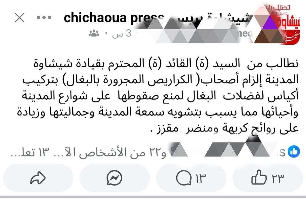 وطالب المواطن في تدوينته السلطات المحلية بالتدخل لإلزام أصحاب هذه العربات بتركيب أكياس مخصصة لجمع فضلات الحمير والبغال، تفادياً لتلويث الأماكن العامة والحفاظ على نظافة المدينة. وقد لقيت هذه الدعوة تفاعلاً واسعاً من قبل رواد مواقع التواصل الاجتماعي، حيث أبدى العديد من المواطنين تأييدهم للفكرة من خلال الإعجابات والتعليقات، التي شددت على ضرورة اتخاذ إجراءات فورية للحد من هذه الظاهرة المتكررة.