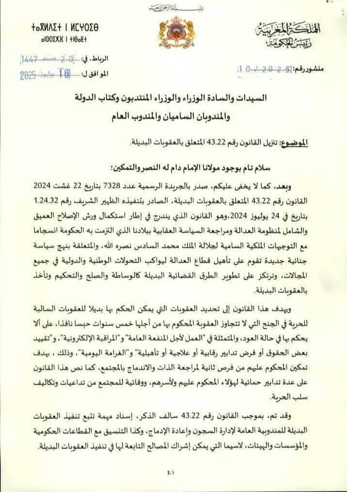أصدر عزيز أخنوش، رئيس الحكومة، منشورا موجها إلى الوزراء والوزراء المنتدبين وكتّاب الدولة والمندوبين السامين والمندوب العام بشأن تنزيل القانون رقم 43.22 المتعلق بالعقوبات البديلة؛ وهو القانون الذي يندرج في إطار استكمال ورش الإصلاح العميق والشامل المنظومة العدالة ومراجعة السياسة العقابية بالمغرب الذي التزمت به الحكومة انسجاما مع توجيهات الملك محمد السادس والمتعلقة بنهج سياسة جنائية جديدة تقوم على تأهيل قطاع العدالة ليواكب التحولات الوطنية والدولية في جميع المجالات، وترتكز على تطوير الطرق القضائية البديلة كالوساطة والصلح والتحكيم وتأخذ بالعقوبات البديلة.