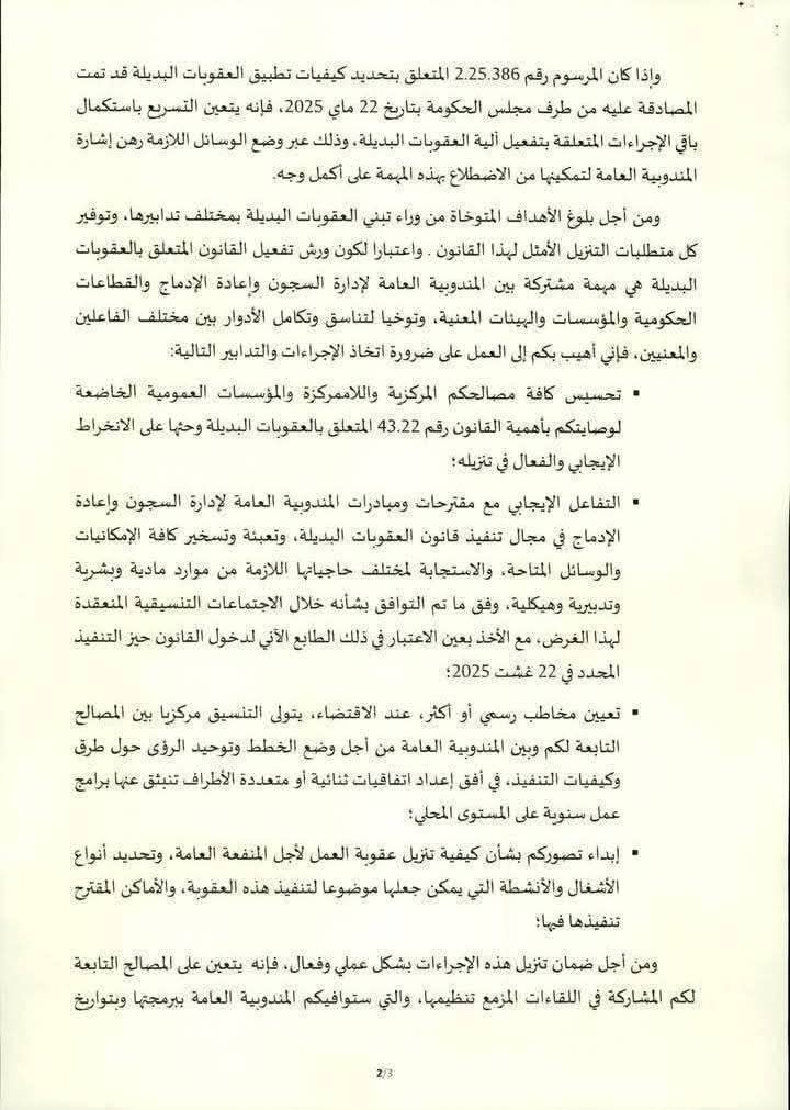 ومن أجل تحقيق الأهداف المتوخاة من تبني العقوبات البديلة بمختلف تدابيرها، وتوفير كل متطلبات التنزيل الأمثل لهذا القانون، واعتبارا لكون ورش تفعيل القانون مهمة مشتركة بين المندوبية العامة والقطاعات الحكومية والمؤسسات والهيئات المعنية، وتوخيا لتناسق وتكامل الأدوار بين مختلف المتدخلين، أهاب المنشور باتخاذ مجموعة من الإجراءات؛ أبرزها تحسيس كافة المصالح المركزية واللاممركزة والمؤسسات العمومية الخاضعة للوصاية بأهمية القانون رقم 43.22، وحثها على الانخراط الإيجابي والفعال في تنزيله والتفاعل البناء مع مقترحات ومبادرات المندوبية العامة لإدارة السجون في مجال تنفيذ القانون، وتعبئة وتسخير جميع الإمكانيات المتاحة، والاستجابة لحاجيات المندوبية من موارد مادية وبشرية وتدبيرية وهيكلية، وفق ما تم الاتفاق عليه في الاجتماعات التنسيقية، مع مراعاة الطابع الآني لدخول القانون حيز التنفيذ المحدد في 22 غشت 2025.