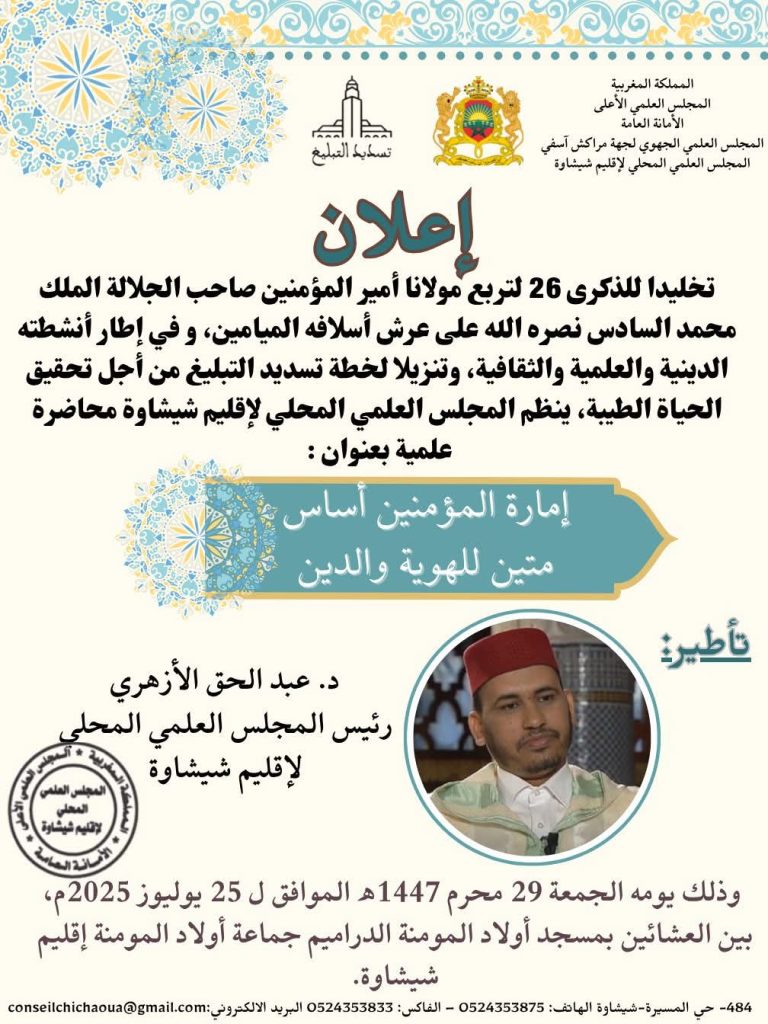 في إطار تخليد الذكرى السادسة والعشرين لاعتلاء صاحب الجلالة الملك محمد السادس نصره الله وأيده عرش أسلافه الميامين، وتنزيلاً لخطة “تسديد التبليغ من أجل تحقيق الحياة الطيبة”، ينظم المجلس العلمي المحلي لإقليم شيشاوة محاضرة علمية تحت عنوان:”إمارة المؤمنين: أساس متين للهوية والدين”.