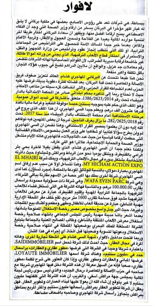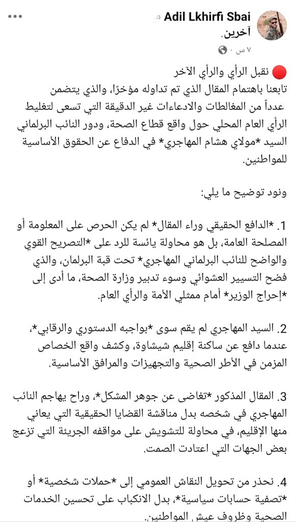 “الدافع الحقيقي وراء المقال لم يكن الحرص على المعلومة أو المصلحة العامة، بل هو محاولة يائسة للرد على التصريح القوي والواضح للنائب المهاجري، والذي فضح التسيير العشوائي وسوء تدبير وزارة الصحة.”
