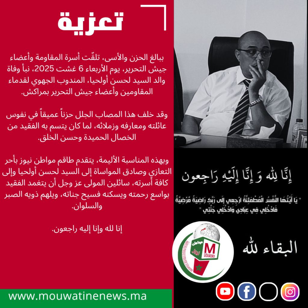 وبهذه المناسبة الأليمة، يتقدم طاقم مواطن نيوز بأحر التعازي وصادق المواساة إلى السيد لحسن أولحيا وإلى كافة أسرته، سائلين المولى عز وجل أن يتغمد الفقيد بواسع رحمته ويسكنه فسيح جناته، ويلهم ذويه الصبر والسلوان.