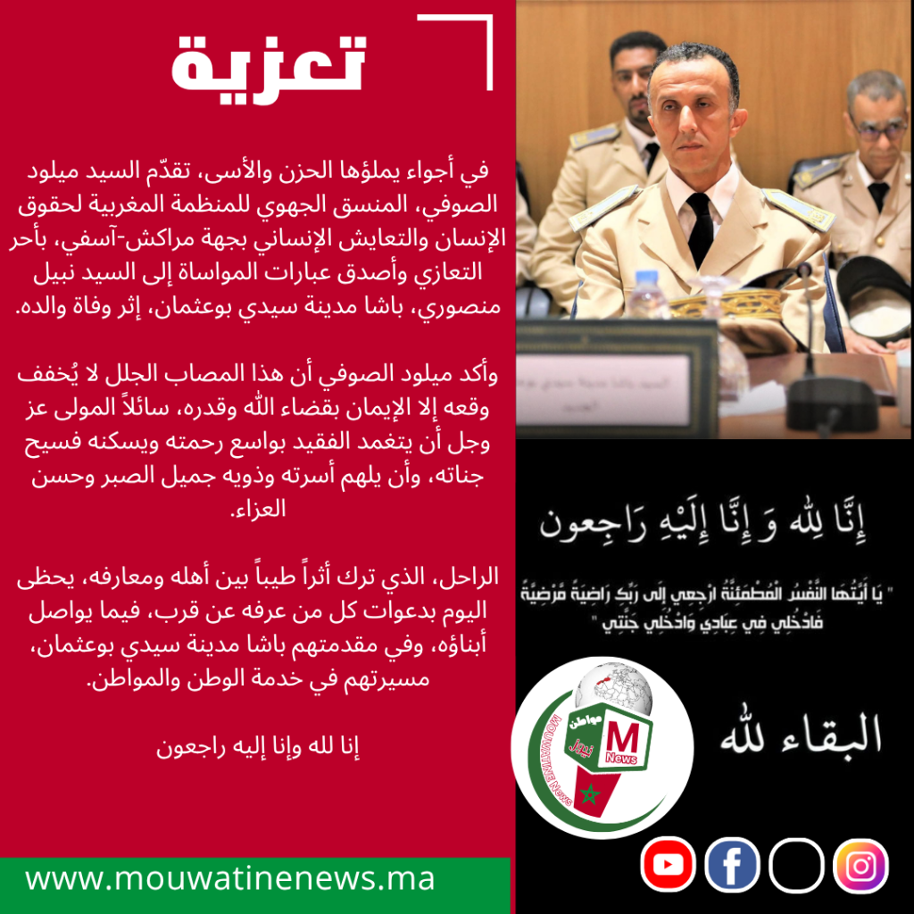 في أجواء يملؤها الحزن والأسى، تقدّم السيد ميلود الصوفي، المنسق الجهوي للمنظمة المغربية لحقوق الإنسان والتعايش الإنساني بجهة مراكش-آسفي، بأحر التعازي وأصدق عبارات المواساة إلى السيد نبيل منصوري، باشا مدينة سيدي بوعثمان، إثر وفاة والده.