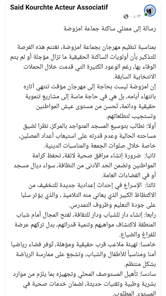 أثار الفاعل الجمعوي سعيد كرشت، من جماعة امزوضة بإقليم شيشاوة، نقاشًا واسعًا عبر مواقع التواصل الاجتماعي، بعد نشره رسالة مفتوحة على صفحته الشخصية بـ”فيسبوك” موجّهة إلى ممثلي الساكنة، بمناسبة تنظيم مهرجان محلي.