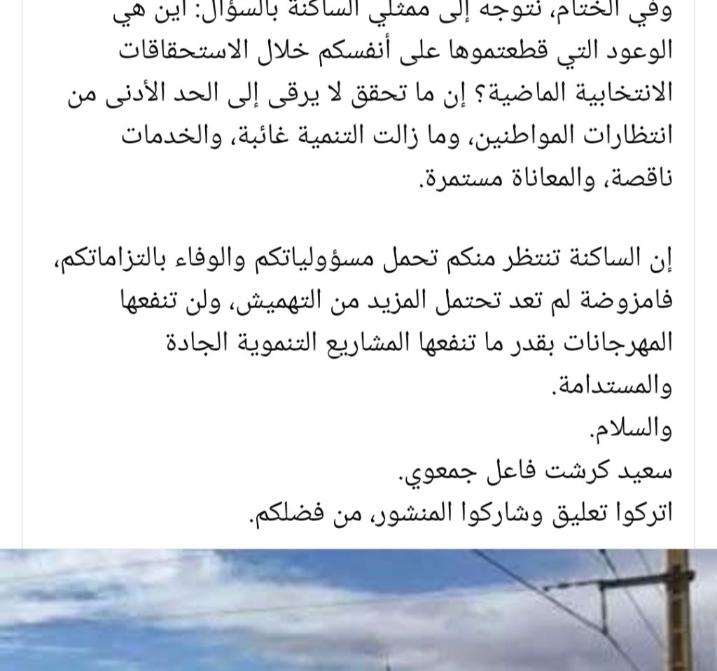 وختم كرشت رسالته بطرح سؤال مباشر على المنتخبين: “أين هي الوعود التي قطعتموها خلال الاستحقاقات الانتخابية؟”، مؤكداً أن التنمية الحقيقية ما زالت غائبة، وأن المهرجانات لا يمكن أن تعوض غياب المشاريع التنموية المستدامة التي تنتظرها الساكنة منذ سنوات.