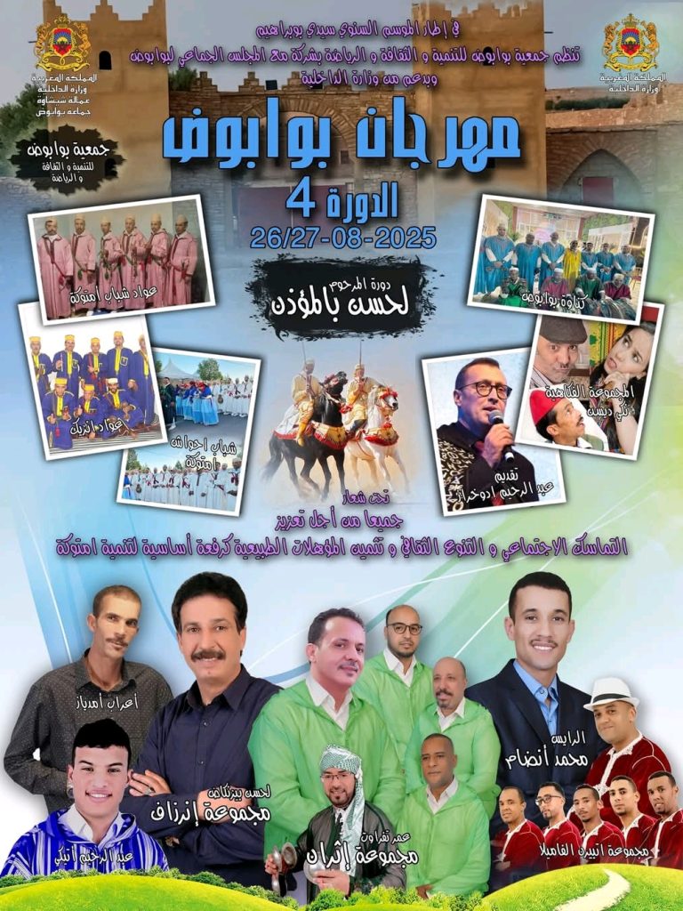 ويشكل المهرجان، في دورته الرابعة، مناسبة لترسيخ روح التماسك الاجتماعي وتعزيز مكانة التنوع الثقافي باعتباره عنصرًا أساسيًا في الهوية المحلية، إلى جانب تثمين المؤهلات الطبيعية والسياحية التي تجعل من بوابوض وجهة واعدة للتنمية المستدامة.