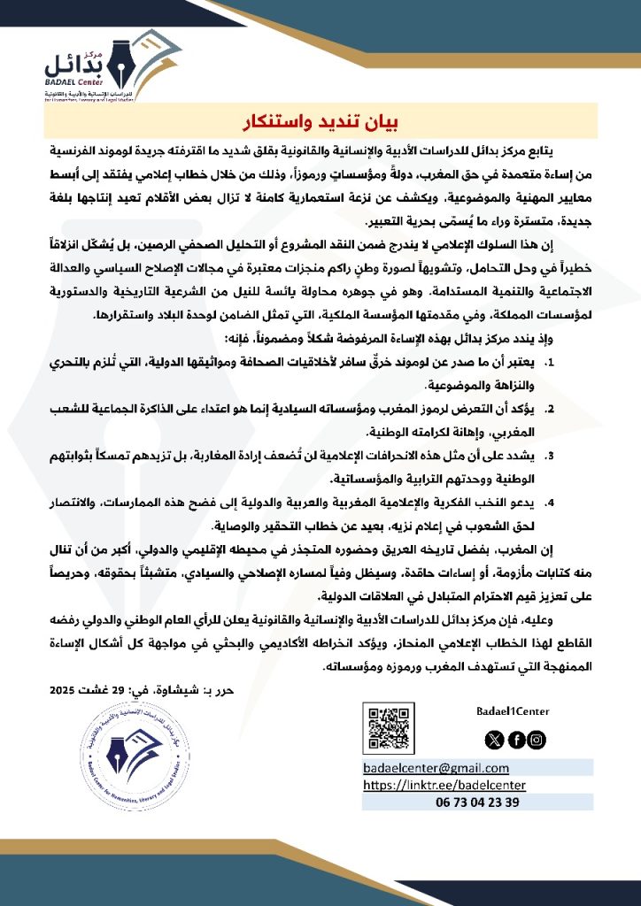 وأوضح البيان أن ما صدر عن الصحيفة الفرنسية يشكل “خرقاً سافراً لأخلاقيات الصحافة ومواثيقها الدولية التي تلزم بالتحري والنزاهة والموضوعية”، معتبراً أن الهدف من هذه الحملة الإعلامية هو النيل من صورة المغرب وتشويه منجزاته في مجالات الإصلاح السياسي والتنمية والعدالة الاجتماعية.
