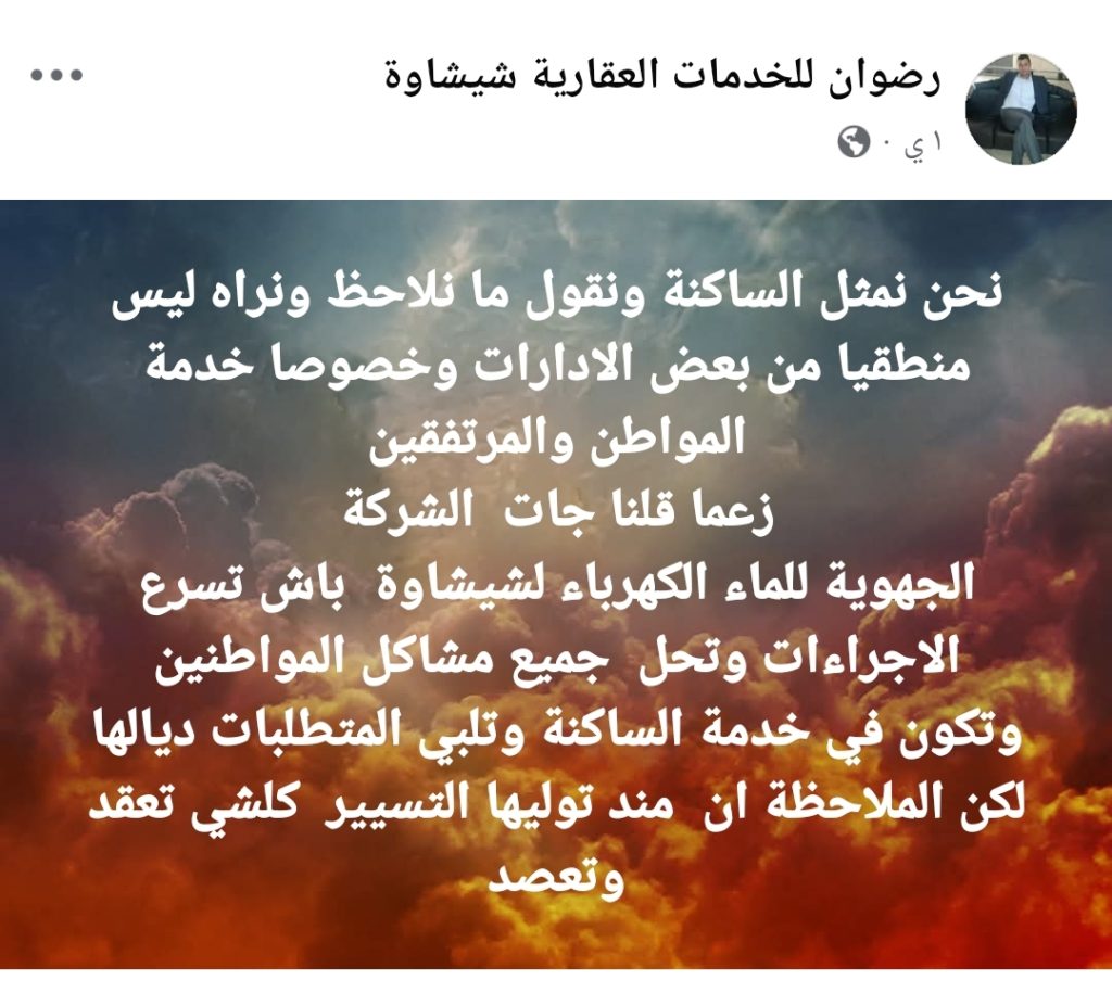 “قدوم الشركة الجهوية إلى شيشاوة كان يُفترض أن يسرّع الإجراءات ويحسن الخدمات، لكن الواقع أبان عن تعقيد أكبر ومعاناة مضاعفة للمواطنين”.