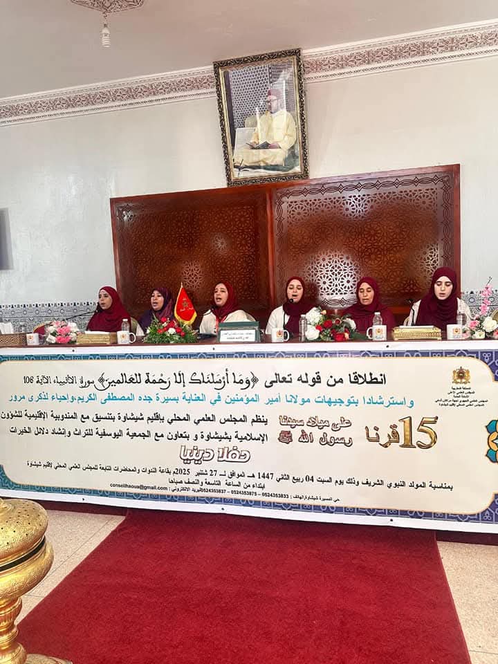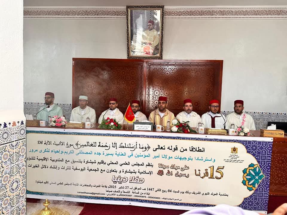 نظم المجلس العلمي المحلي لإقليم شيشاوة بتنسيق مع المندوبية الإقليمية للشؤون الإسلامية بشيشاوة، وبتعاون مع الجمعية اليوسفية للتراث والسماع وإنشاد دلائل الخيرات، صباح يوم السبت 04 ربيع الثاني 1447هـ/ الموافق ل 27 شتنبر 2025م، بقاعة الندوات والمحاضرات التابعة للمجلس العلمي المحلي لشيشاوة.