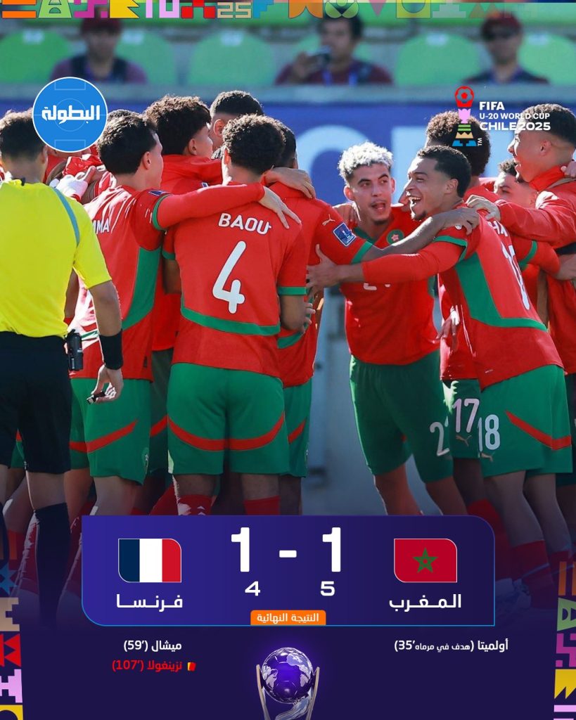 في إنجاز غير مسبوق في تاريخ كرة القدم الوطنية، تمكن المنتخب المغربي لأقل من عشرين سنة من حجز بطاقة التأهل إلى نهائي كأس العالم، عقب فوزه المثير على نظيره الفرنسي بضربات الترجيح، بعدما انتهى الوقت الأصلي والإضافي بالتعادل الإيجابي هدفًا لمثله.
