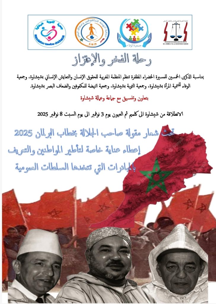 في مبادرة تضامنية وثقافية متميزة، نظّم المكتب الإقليمي للمنظمة المغربية لحقوق الإنسان والتعايش الإنساني بشيشاوة، بتعاون مع مجموعة من الجمعيات والتعاونيات المحلية، قافلة وطنية تحت عنوان «في رحاب الصحراء»، وذلك خلال الفترة من 3 إلى 9 نونبر 2025، احتفاءً بالذكرى الخمسين للمسيرة الخضراء المظفرة.