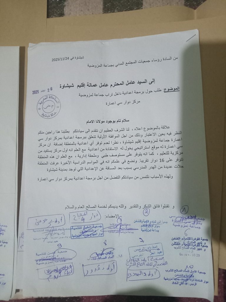 وجّهت جمعيات المجتمع المدني بجماعة المزوضية مراسلة رسمية إلى السيد عامل عمالة إقليم شيشاوة، تطالب من خلالها ببرمجة مؤسسة تعليمية إعدادية بمركز دوار سي أعمارة، وذلك استجابة لحاجيات الساكنة المحلية وتفادي الإكراهات التي يعاني منها التلاميذ بالمنطقة.