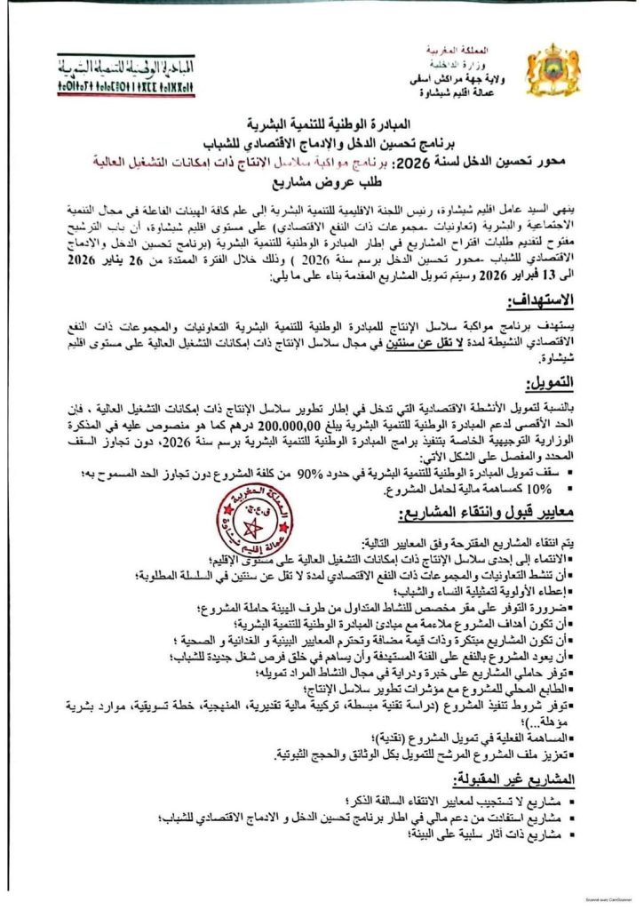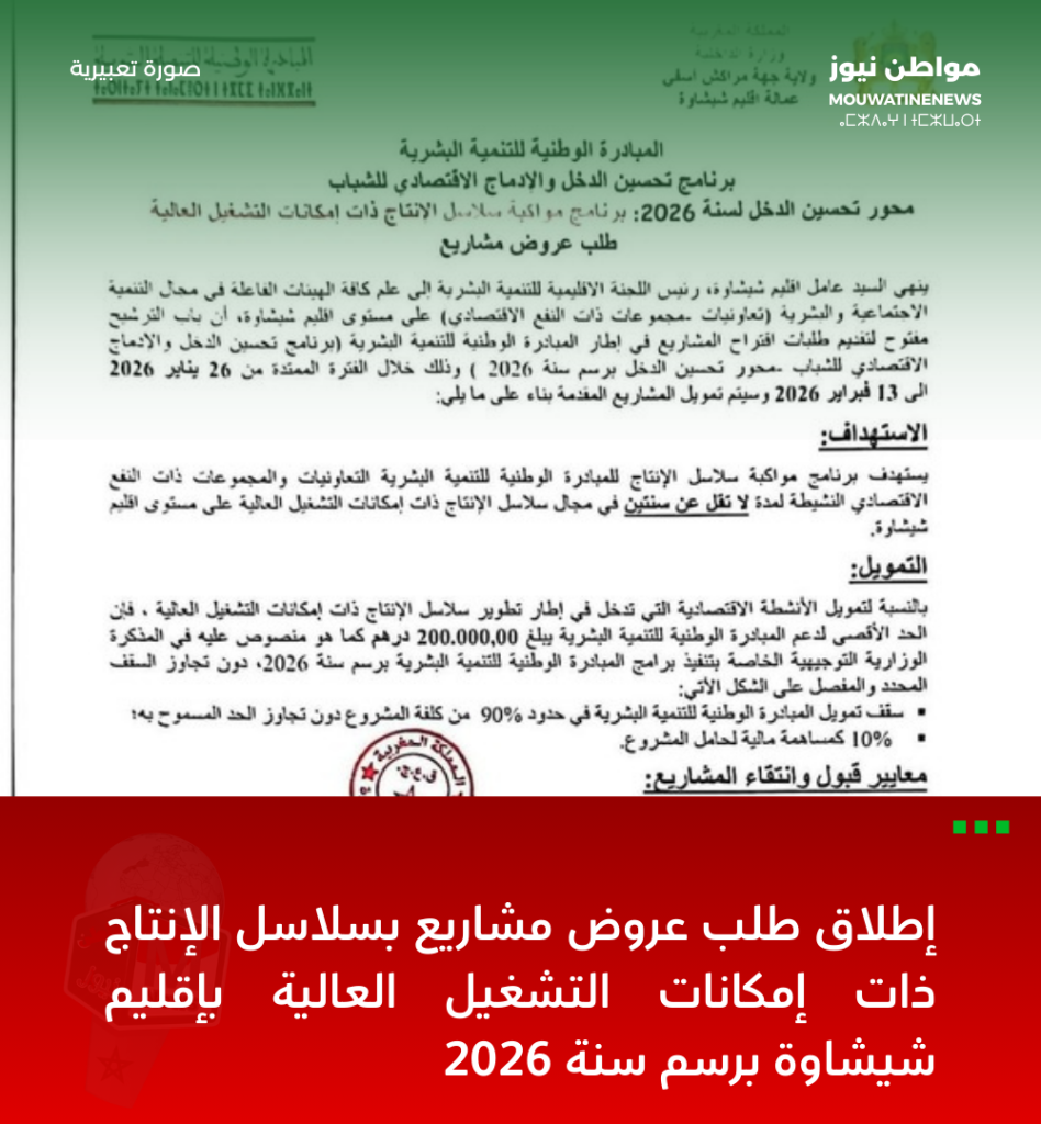 في إطار جهود المبادرة الوطنية للتنمية البشرية الرامية إلى تعزيز الإدماج الاقتصادي وتحسين الدخل، أعلن قسم العمل الاجتماعي بعمالة إقليم شيشاوة عن فتح طلب عروض مشاريع لسنة 2026، يهم برنامج مواكبة سلاسل الإنتاج ذات إمكانات التشغيل العالية بمختلف جماعات الإقليم.