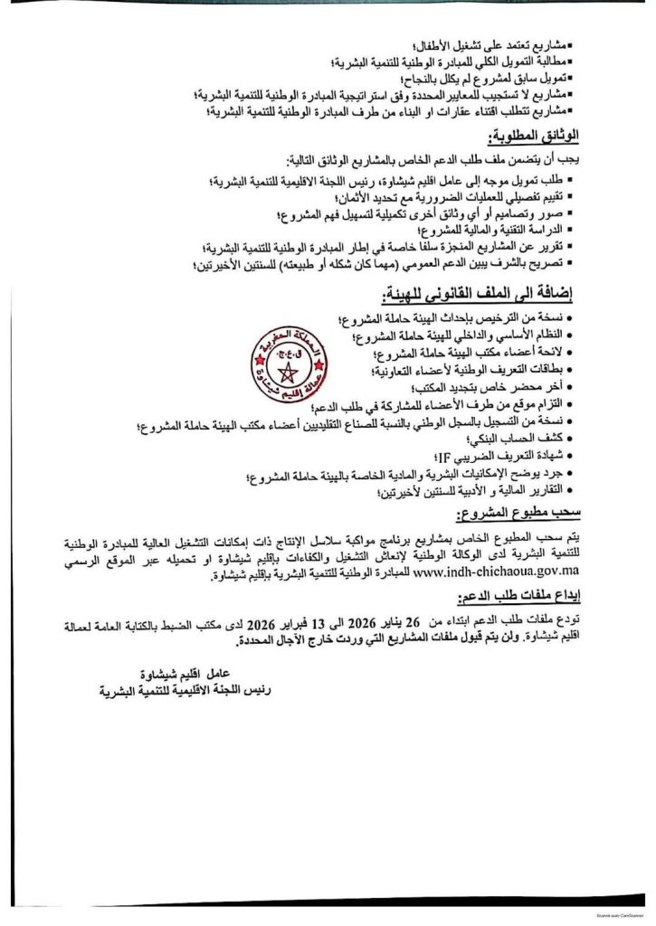 سيتم استقبال ملفات الترشح لدى قسم العمل الاجتماعي بعمالة شيشاوة داخل الآجال المحددة في الإعلان الرسمي، مع توفير مواكبة تقنية للراغبين في إعداد مشاريعهم، وذلك عبر تنظيم لقاءات تواصلية وورشات توجيهية لفائدة المعنيين.